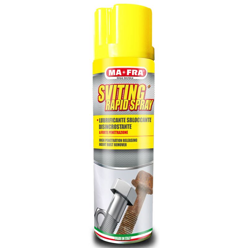 SVITING Rapid Spray, gracias a su fuerte acción penetrante, permite una rápida y óptima lubricación sobre cualquier superficie (como cerraduras o juntas acopladas) y no agrede las partes tratadas (ni siquiera las más delicadas como goma o partes pintada