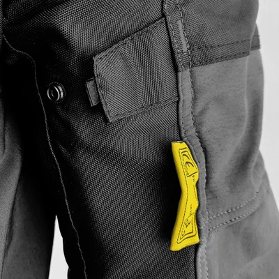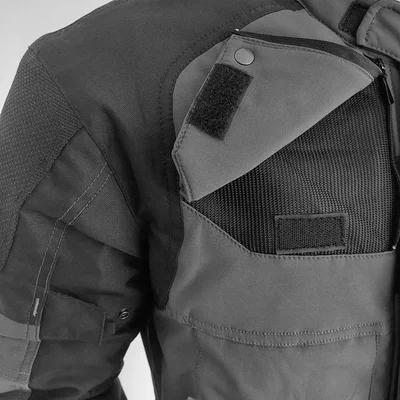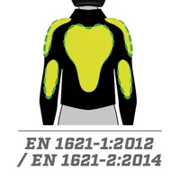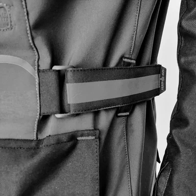 Una prenda muy versátil, con circunferencia de brazo ajustable y correas de cintura adaptables. Los cierres de velcro en cuello y puños, junto con elementos reflectantes en puntos clave, se complementan con protectores con certificación CE EN1621 en codos, hombros y espalda.