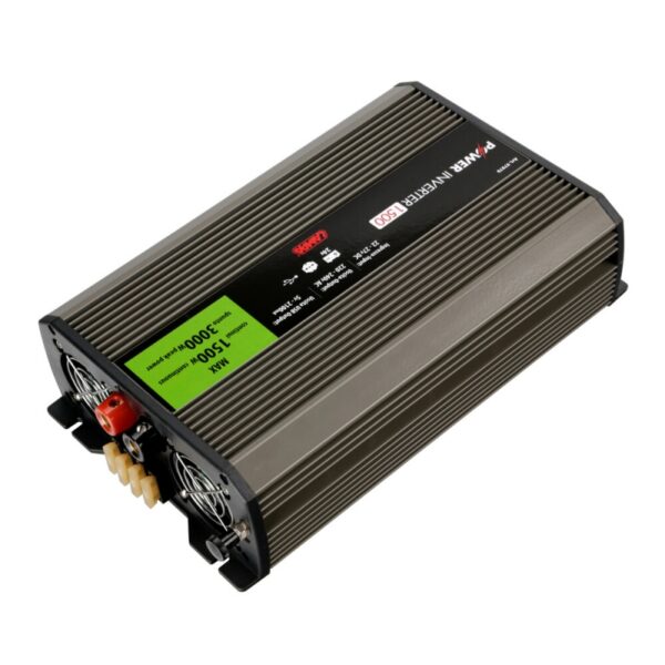 Consumo máximo 1500W continuo / 3000W de pico. Transformador de corriente de 24V a 220 V. Permite conectar aparatos alimentados a 220 V a cualquier fuente de energía de 24V. Estructura de aleación de aluminio. Protección contra cortocircuitos. Forma onda en salida: sinusoidal modificada. Enchufe doble tipo Schuko 3 orificios